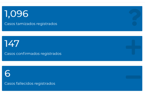 El Ministerio de Salud registró durante este domingo 6 fallecimientos por Covid-19, 147 casos nuevos y se practicaron 1,096 tamizajes.