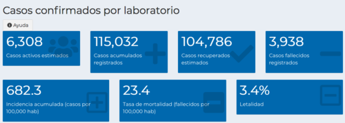 Salud detalla que, hasta la fecha, se reportan 682.3 casos positivos de Covid-19 por cada 100 mil habitantes. Además, la tasa de fallecimientos es de 23.4 por cada 100 mil y el porcentaje de fallecidos con relación a los contagiados es de 3.4%.