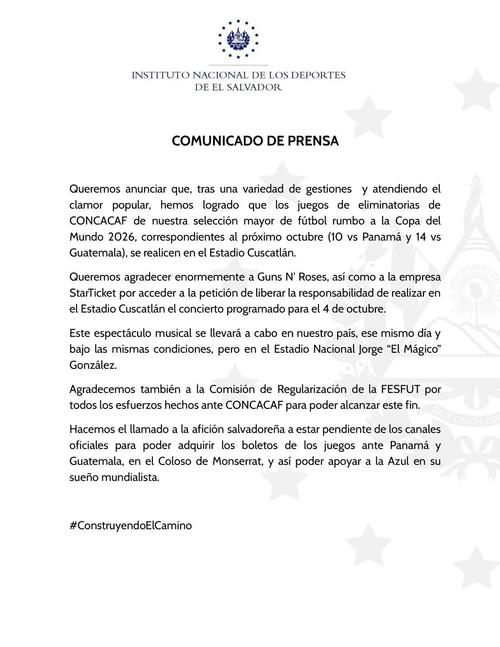 El Instituto Nacional de los Deportes de El Salvador publicó en redes sociales que logró resolver el cambio de sede para el 10 y 14 de octubre.