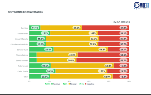 Según el informe, Samuel Morales, hermano del expresidente Jimmy Morales, es el candidato con la mayor desaprobación en las redes sociales, quien, del total de las menciones a su persona, el 51.3% son negativas, comparado con un 6.5% que son a su favor y un 42.2% neutrales.
