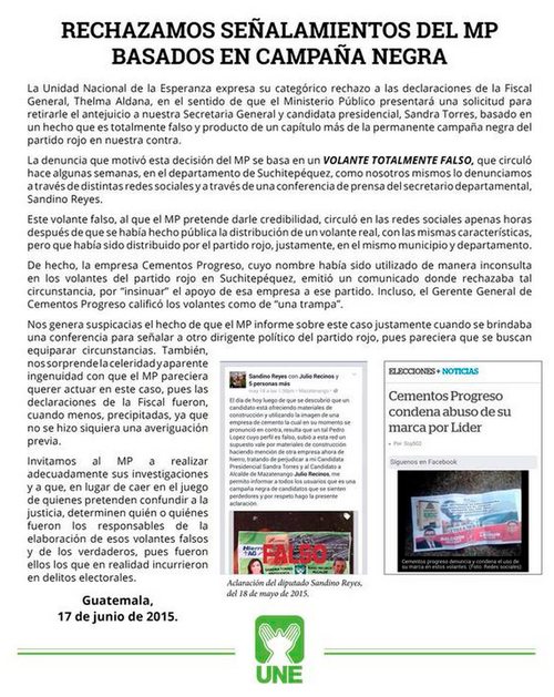 El partido Unidad Nacional de la Esperanza (UNE) emitió un comunicado en el cual asegura que la petición de antejuicio contra su candidata a la presidencia, Sandra Torres, se basa en “un hecho que es totalmente falso“ y que es producto de una campaña negra en su contra.