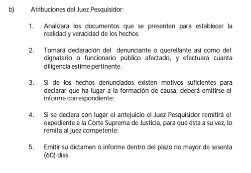Este proceso de antejuicio es distinto al que se ha observado contra la vicepresidenta o el presidente. Al recibir la solicitud del MP, la Corte Suprema de Justicia debe nombrar a un juez pesquisidor que puede ser uno de los magistrados de la CSJ, un magistrado de Sala de Apelaciones o un Juez de Primera Instancia del ramo penal.