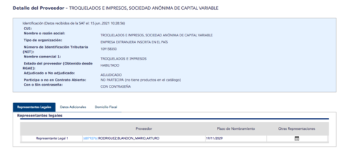 De acuerdo con Guatecompras el proveedor al que le fue adjudicado el concurso es: "Troquelados e impresos, Sociedad Anónima de Capital Variable", según se observa en el sitio web.