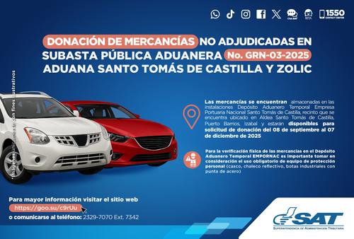 La Superintendencia de Administración Tributaria (SAT), a través de la Intendencia de Aduanas, anunció una donación de autos, disponible para instituciones públicas y de beneficencia.