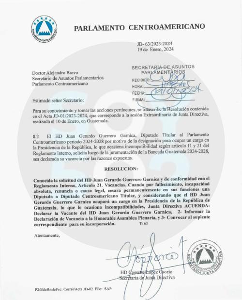"Yo declaré mi vacancia en el Parlacen el mismo 14 de enero. Seguramente no han actualizado los datos, pero yo presenté mi vacancia por escrito y de manera verbal", manifestó y entregó copia de la resolución del parlamento, donde se declara vacante su puesto y convocan al suplente.