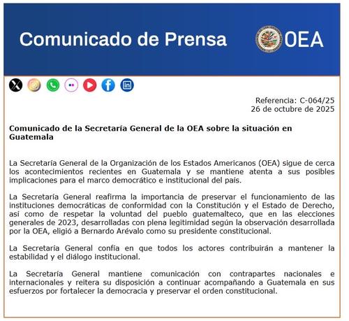 A través de las redes sociales y mediante un comunicado, el diplomático dio a conocer que la instancia a su cargo "sigue de cerca los acontecimientos recientes en Guatemala y se mantiene atenta a sus posibles implicaciones para el marco democrático e institucional del país".