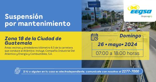 La Empresa Eléctrica de Guatemala (EEGSA) sigue realizando mantenimiento a su red, y ha dado a conocer el sector que no tendrán luz este domingo 26 de mayo, desde las 7:00 hasta las 18:00 horas.