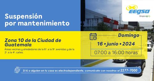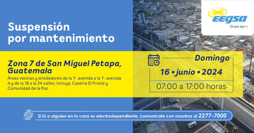 La Empresa Eléctrica de Guatemala (EEGSA) sigue realizando mantenimiento a su red, y ha dado a conocer los sectores que no tendrán luz este domingo 16 de junio, desde las 7:00 hasta las 17:00 horas.