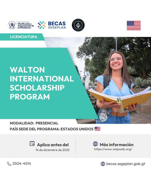 La Fundación Walton, en colaboración con Segeplan, ha abierto la convocatoria para el prestigioso "Walton International Scholarship Program". Esta beca cubre la licenciatura durante 4 años en universidades de EE.UU.