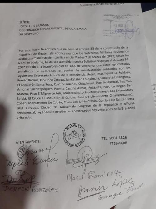 Una nueva serie de protestas fue anunciada para esta semana en la Ciudad de Guatemala y otros departamentos del país. Estas movilizaciones se realizarán por parte de veteranos militares, según se lee en una carta dirigida hacia Gobernación Departamental.