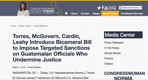 "En Guatemala, las acciones de un gobierno que enfrenta investigaciones de corrupción han puesto en peligro la estabilidad y la democracia del país y han socavado los esfuerzos apoyados por los Estados Unidos para abordar la causa fundamental de la migración", señala el documento colgado en la página de Torres.