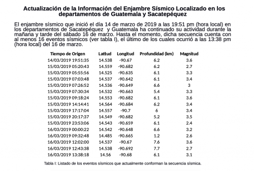 Según el Insivumeh, el enjambre sísmico inició el jueves a las 19:51 horas. Hasta el momento se han registrado 16 temblores con magnitudes que van de 2.7 a 3.6 en la escala de Richter.