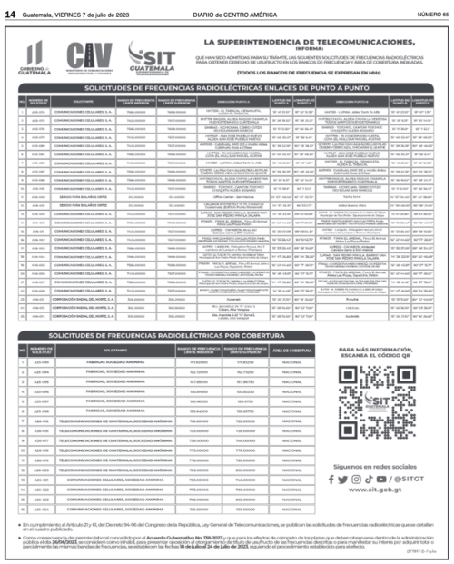 La Superintendencia de Telecomunicaciones SIT se prepara para realizar otra subasta de frecuencias. En el Diario de Centro América (DCA) ha publicado el listado de solicitudes de frecuencias radioeléctricas que han sido admitidas para trámite para que puedan obtener el derecho de usufructo en rangos de frecuencia y área de coberturas que se detallan en el listado.