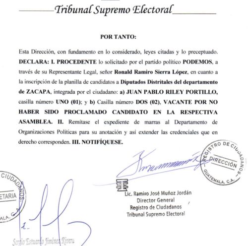 Recientemente el Registro de Ciudadanos avaló su inscripción como candidato a diputado por el distrito de Zacapa, en representación del partido Podemos, de Roberto Arzú. Va en la primera casilla.