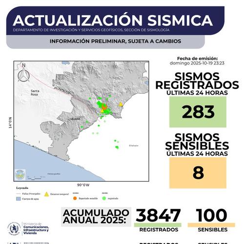 El Instituto Nacional de Sismología, Vulcanología, Meteorología e Hidrología (Insivumeh) afirmó que en tan solo 24 horas se han registrado 283 sismos en el territorio nacional, de los cuales 8 han sido sensibles.