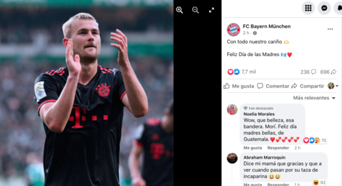 A través de las redes sociales el famoso equipo de fútbol subió una imagen del defensa neerlandés Matthijs de Ligt haciendo una ovación con las manos al público, con el mensaje: "Con todo nuestro cariño, Feliz Día de las Madres", acompañado de la bandera de Guatemala y un emoticón de dos manos formando un corazón.