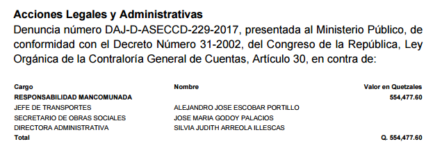 Durante el lapso en que no hay señales, la SOSEP estuvo bajo el mando de Sandra Torres, Rosa Leal de Pérez y Patricia de Morales. La denuncia de la CGC está dirigida contra el jefe de transportes, Alejandro Escobar; el jefe de la SOSEP, José María Godoy; y la directora administrativa, Silvia Arreola.