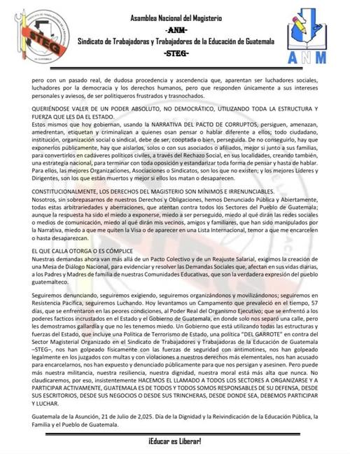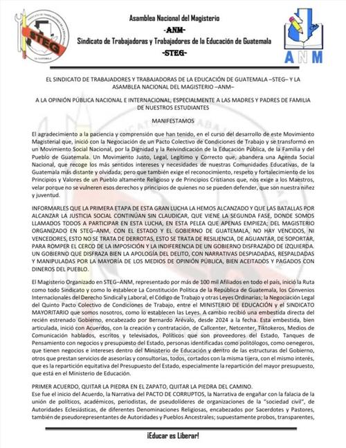 Finalmente, el STEG indicó que insistirá en la creación de una Mesa de Diálogo Nacional donde se aborden las demandas sociales que afectan directamente a las familias y estudiantes en las comunidades más necesitadas del país