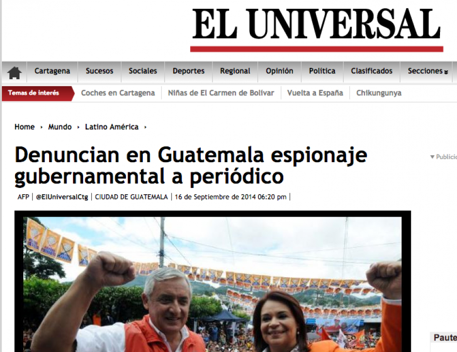 El colombiano El Universal informó sobre la denuncia sobre "espionaje gubernamental a un periódico", en cuyo texto habla sobre la ola de críticas en Guatemala sobre la posible infiltración del Estado en los diarios guatemaltecos.