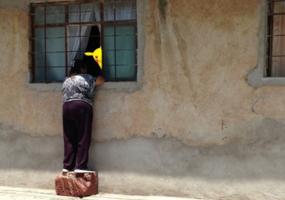 En la foto compartida en redes sociales se puede ver a una señora que se asoma a una ventana y sirviéndose de lo que parece ser una caja observa en el interior de una vivienda.