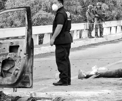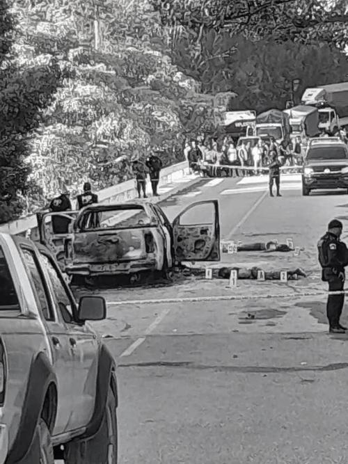Las víctimas fueron localizadas sobre la cinta asfáltica con varios proyectiles de arma de fuego, mientras el vehículo quedó incinerado.