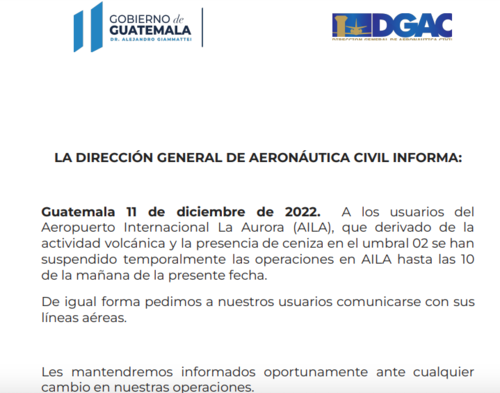En un comunicado oficial, se confirmó que las operaciones en el Aeropuerto Internacional La Aurora fueron suspendidas por la caída de ceniza del volcán de Fuego.