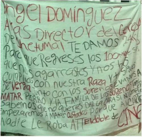 “Ángel Domínguez alias director del Cereso de Chetumal te damos 24 horas para que regreses los 100 mil pesos que nos agarraste” (sic), se lee en el mensaje.