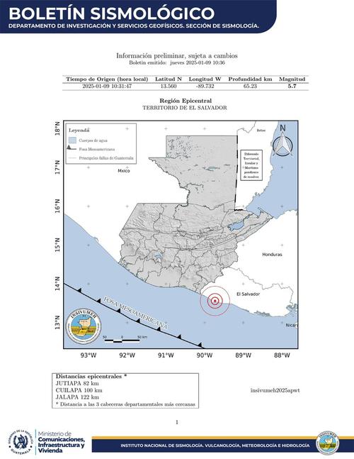 El Instituto Nacional de Sismología, Vulcanología, Meteorología e Hidrología (Invisumeh) informó que el epicentro ocurrió en El Salvador, y que la magnitud oficial fue de 5.7.