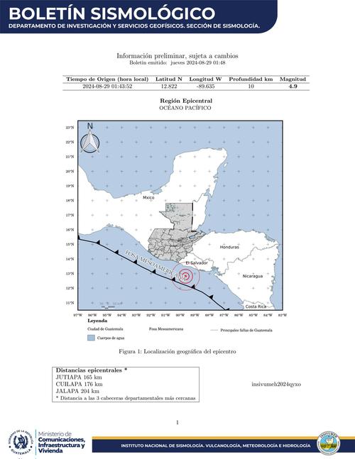 Desde las primeras semanas de agosto, el Insivumeh ha reportado a través de sus boletines informativos una serie de sismo, los cuales han tenido epicentro en el Océano Pacífico y han sido sensible en 3 lugares en específico de Guatemala, siendo estos, Jutiapa, Cuilapa y Jalapa.