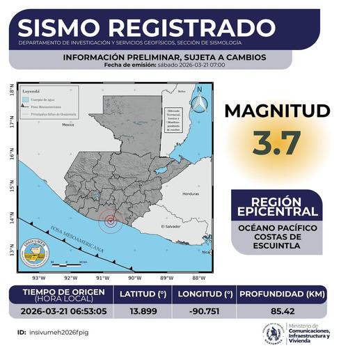 La magnitud registrada fue de 3.7 grados, con epicentro en el Océano Pacífico, costas de Escuintla.