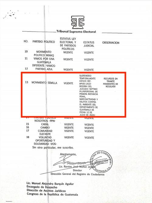 El documento fue firmado por el titular del Registro de Ciudadanos, Ramiro Muñoz, pero no solo se refiere a la vigencia de la agrupación política, en el marco de la Ley Electoral, sino que también hace ver que está suspendida provisionalmente por orden judicial.