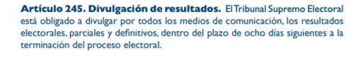 En el artículo 245 de la Ley Electoral y de Partidos Políticos (LEPP) se indica que el TSE debe divulgar "los resultados electorales, parciales y definitivos, dentro del plazo de ocho días siguientes a la terminación del proceso electoral".