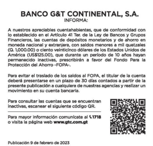 El banco G&T Continental informó que desde el 9 de febrero ha comenzado a correr el tiempo para que los cuentahabientes reclamen su dinero. Según lo que establece la Ley de Bancos y Grupos Financieros artículo 41 Ter. Decreto Número 26-2012, aquellas cuentas que en diez años no han tenido movimiento y tienen un saldo menor de Q 1,000 o US$ 125 serán inactivadas y los fondos serán trasladados al Fondo para la Protección del Ahorro (FOPA).