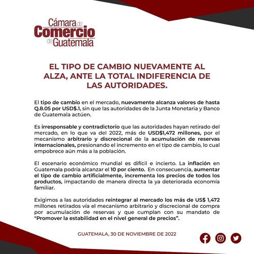 Este miércoles 30 de noviembre el tipo de cambio del dólar estadounidense frente al quetzal registró una subida y se coloca en 7.84. Esto ha provocado la reacción de rechazo por parte de la Cámara de Comercio la cual señala que el alza es arbitrario.