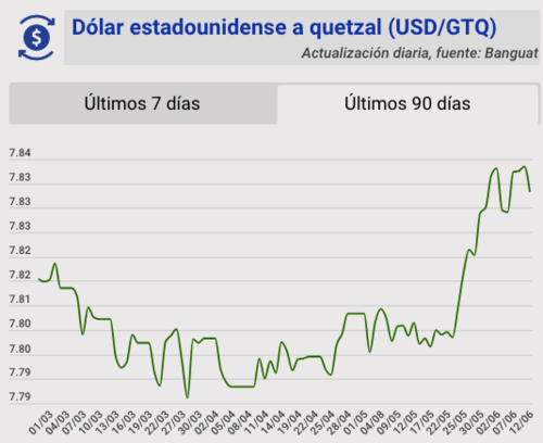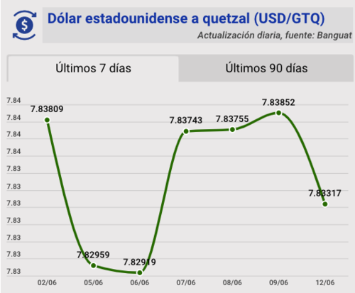 El tipo de cambio del quetzal frente al dólar, para este lunes 12 de junio, quedó en Q7.83317. Se registra una variación de 0.00535 para este día.