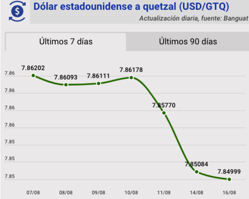 El tipo de cambio del quetzal frente al dólar, para este miércoles 16 de agosto, quedó en Q7.84999. Se registra una variación de 0.00085 para este día.