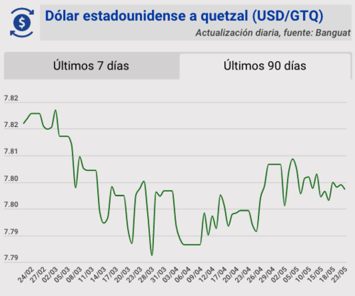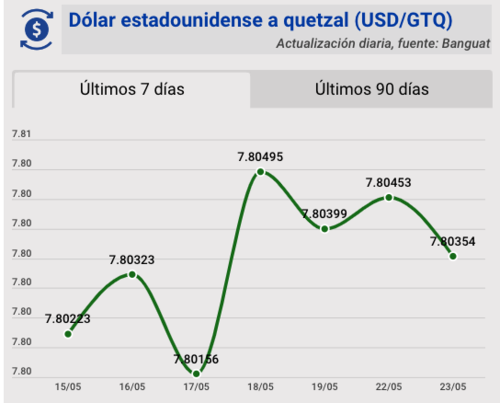 El tipo de cambio del quetzal frente al dólar, para este martes 22 de mayo, quedó en Q7.80354. Se registra una variación de 0.00099 para este día.