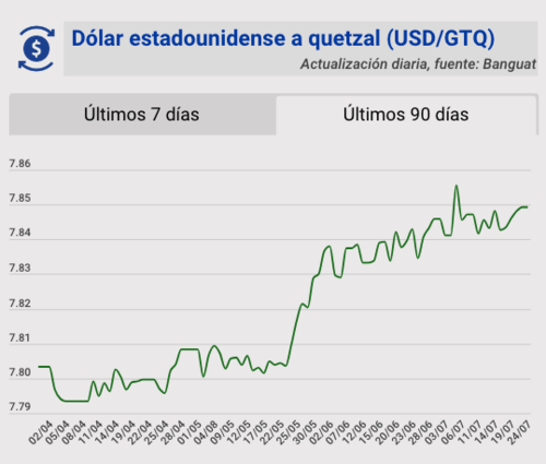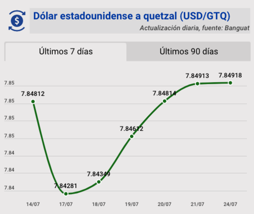 El tipo de cambio del quetzal frente al dólar, para este lunes 24 de julio se cotiza en Q7.84918. Se registra una variación de 0.00005 para este día.