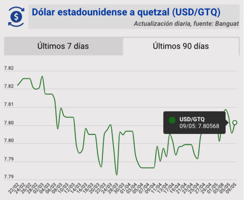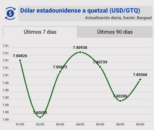 El tipo de cambio del quetzal frente al dólar, para este martes 9 de mayo, quedó en Q7.80568. Se registra un aumento de 0.00288 para este día.