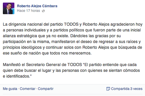 "Ayer se tomó la decisión en el comité ejecutivo. La alianza no tenía ningún sentido de continuar. Cada uno podrá seguir así con su trabajo" dijo Ovidio Monzón, diputado de dicha agrupación política, en declaraciones a la prensa.