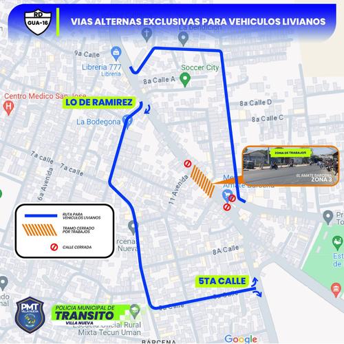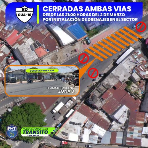 La Policía Municipal de Tránsito (PMT) dio información importante sobre el cierre toral de la ruta RD-16, sobre El Amate, Bárcena, en la zona 3 de Villa Nueva, este sábado 2 de marzo.