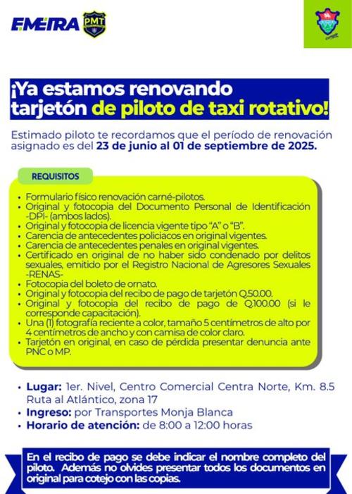 A través de redes sociales, la Policía Municipal de Tránsito (PMT) dio a conocer que desde el 23 de junio se encuentran renovando tarjetón de piloto de taxi rotativo.
