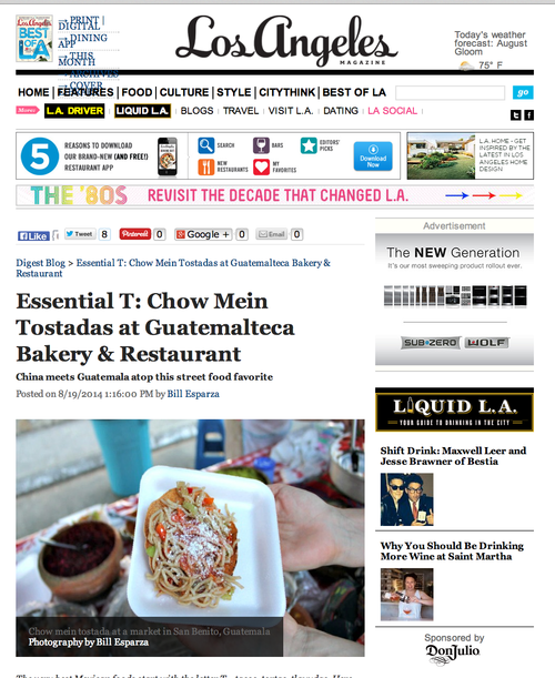 La revista Los Angeles Magazine decidió dedicar uno de sus blogs al restaurante guatemalteco "Guatemalteca Bakery and Restaurant" en Hollywood, por la tradicional tostada con "chow mein".