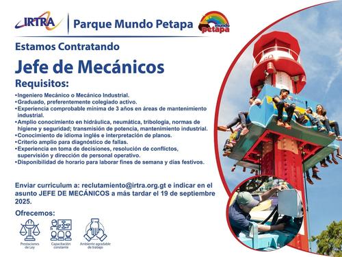 Para aplicar envía tu CV a reclutamiento@irtra.org.gt e indica en el asunto JEFE DE MECÁNICOS, a más tardar el 19 de septiembre.