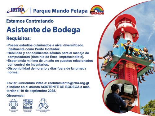 Si deseas aplicar envía tu CV a reclutamiento@irtra.org.gt e indica en el asunto ASISTENTE DE BODEGA, a más tardar el 19 de septiembre.