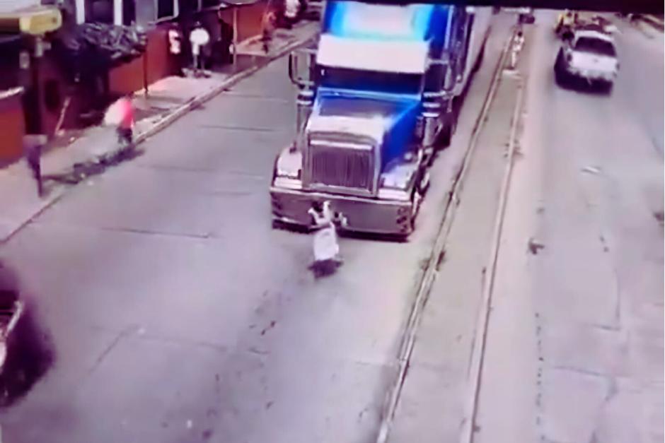 El momento en el que un tráiler atropella a una señora de la tercera edad en Xela y se salva de milagro.
