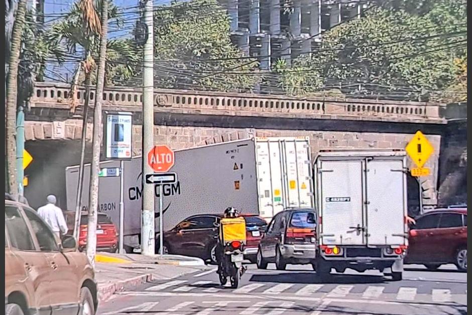 Un vehículo del transporte pesado intentó pasar debajo del puente Penitenciaría, en la 7ma. avenida y 23 calle de la zona 1 capitalina. Sin embargo, se quedó atorado y el furgón se zafó.