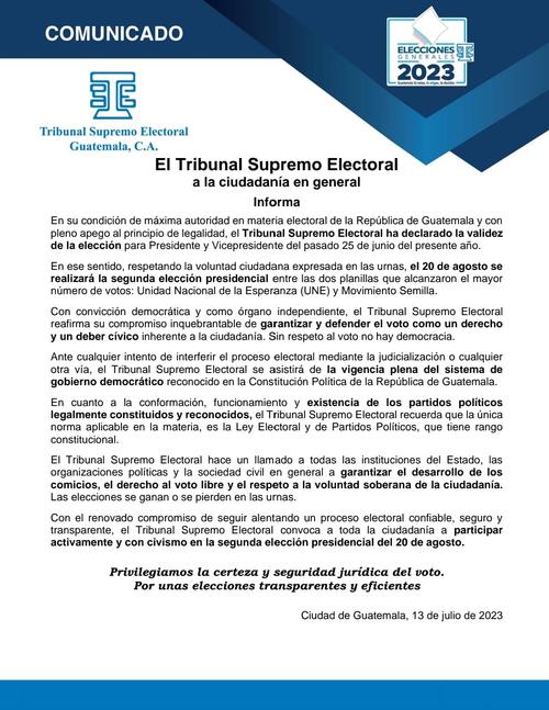 Los magistrados del Tribunal Supremo Electoral (TSE) recordaron que ya declararon la validez de la elección para Presidente y Vicepresidente del pasado 25 de junio y que las dos planillas que alcanzaron el mayor número de votos fueron la Unidad Nacional de la Esperanza (UNE) y Movimiento Semilla, quienes participarán en la segunda vuelta.