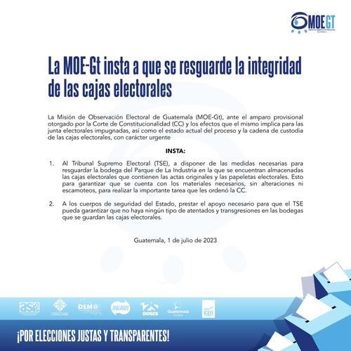 La Misión de Observación Electoral de Guatemala (MOE-Gt) emitió un comunicado luego de que la Corte de Constitucionalidad apoya el amparo solicitado por algunos partidos políticos respecto al resultado de las eleciones celebradas el pasado 25 de junio.