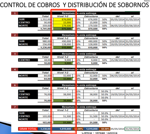 Velásquez añadió que “afortunadamente” se localizaron tablas de control y distribución de los cobros de La Línea, que además de facilitar la investigación, dan cuenta de las cifras que eran otorgadas a los integrantes, incluyendo a “1 y 2”, que podría considerarse como el Presidente y la entonces Vicepresidenta.